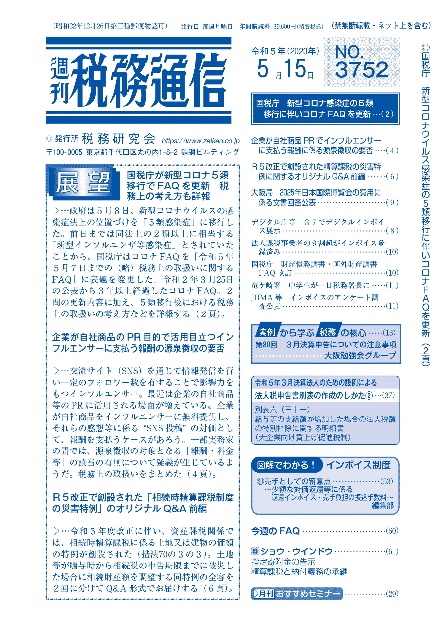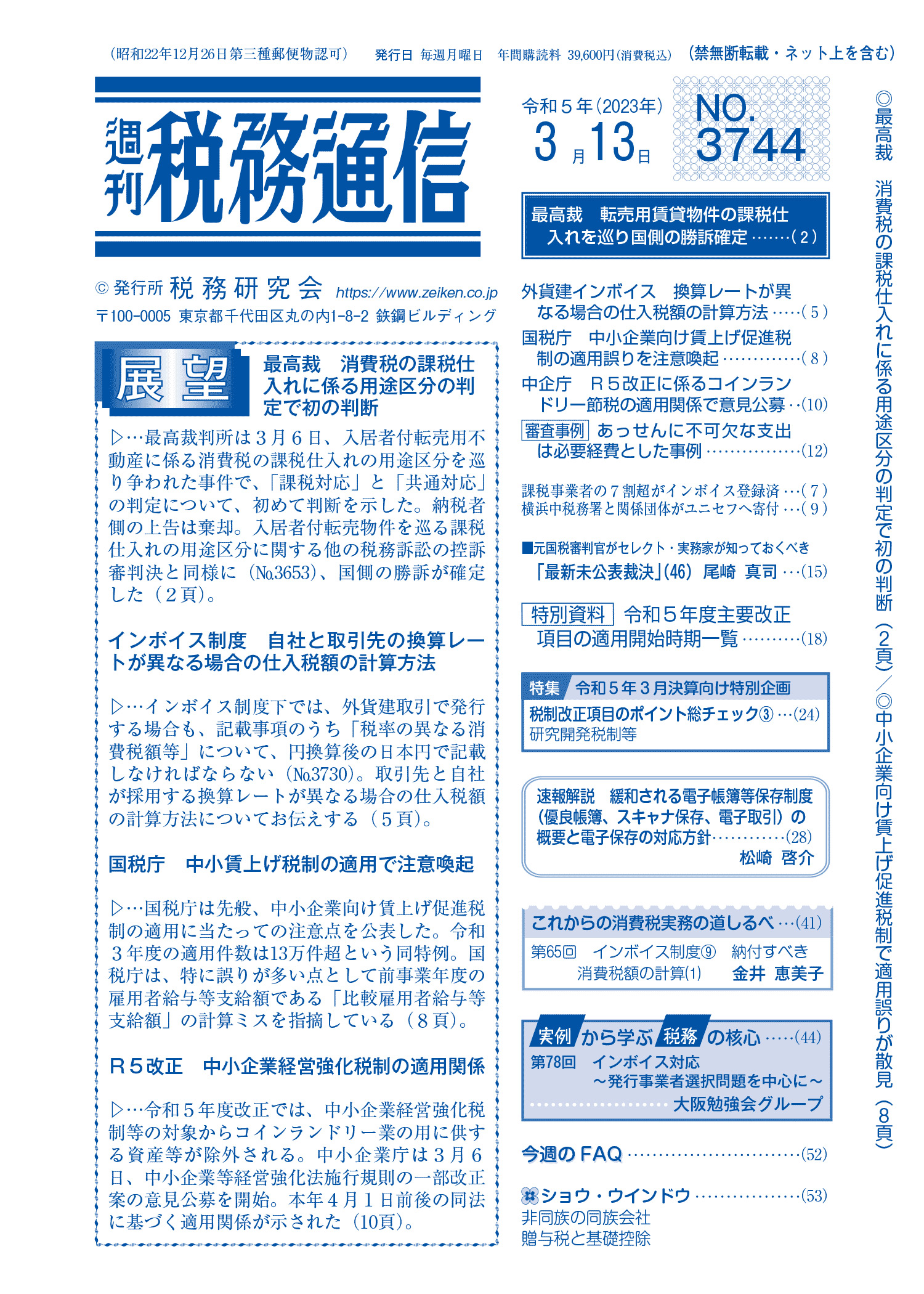 株式会社税務研究会から発刊されている週刊税務通信の2023年5月15日号に原稿執筆しています。