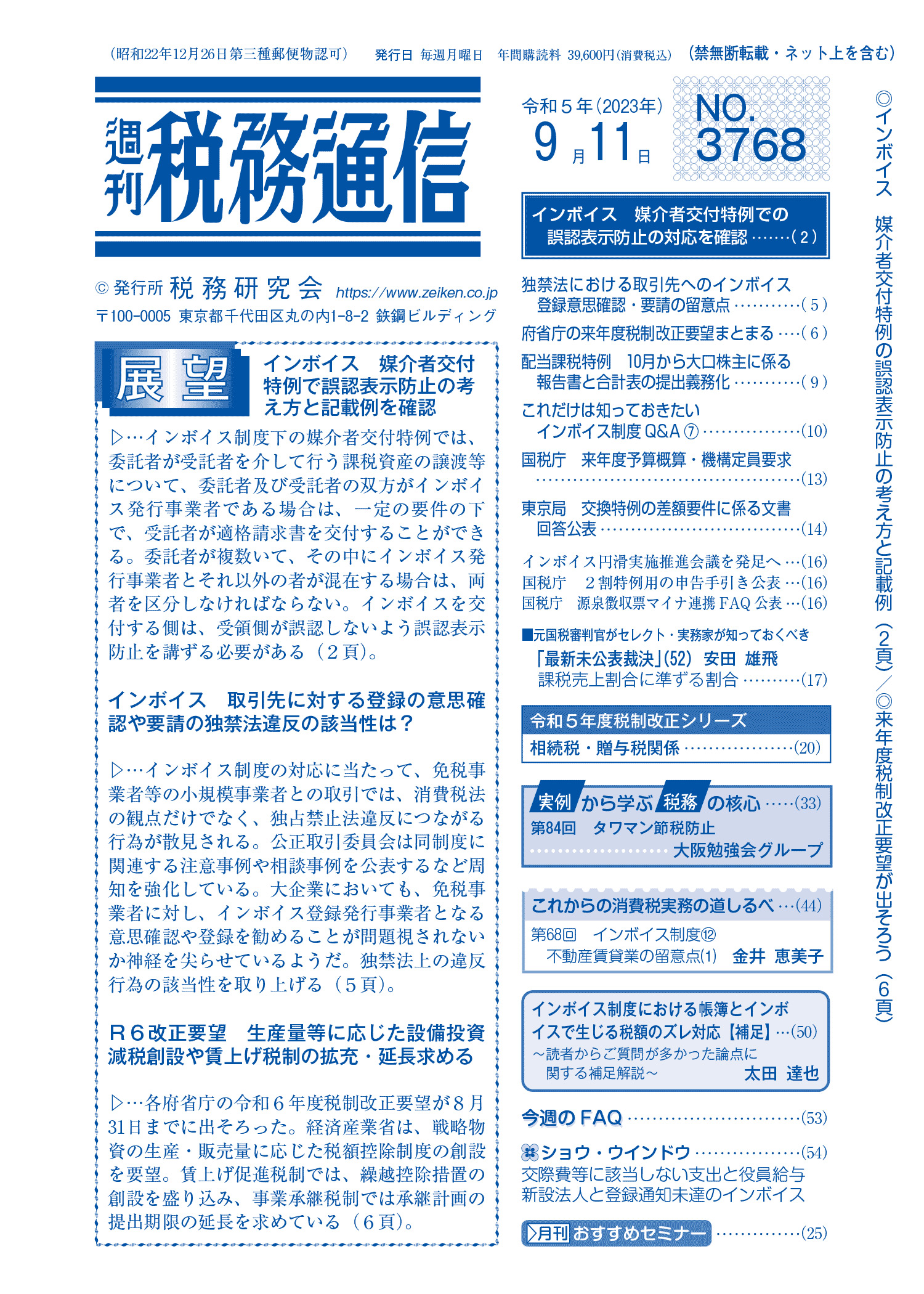 株式会社税務研究会から発刊されている週刊税務通信の2023年9月11日号に原稿執筆しています。