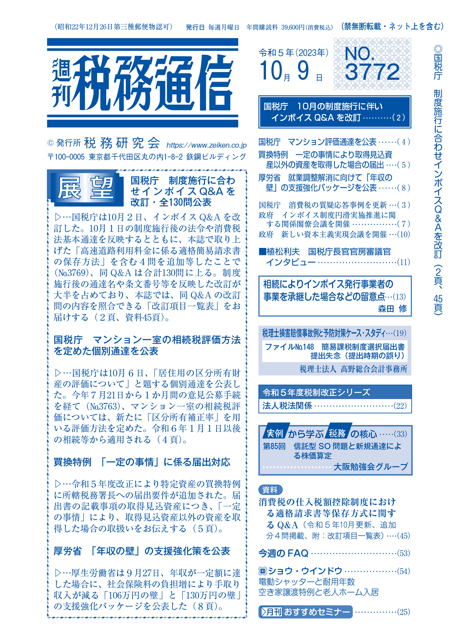 株式会社税務研究会から発刊されている週刊税務通信の2023年10月9日号に原稿執筆しています。