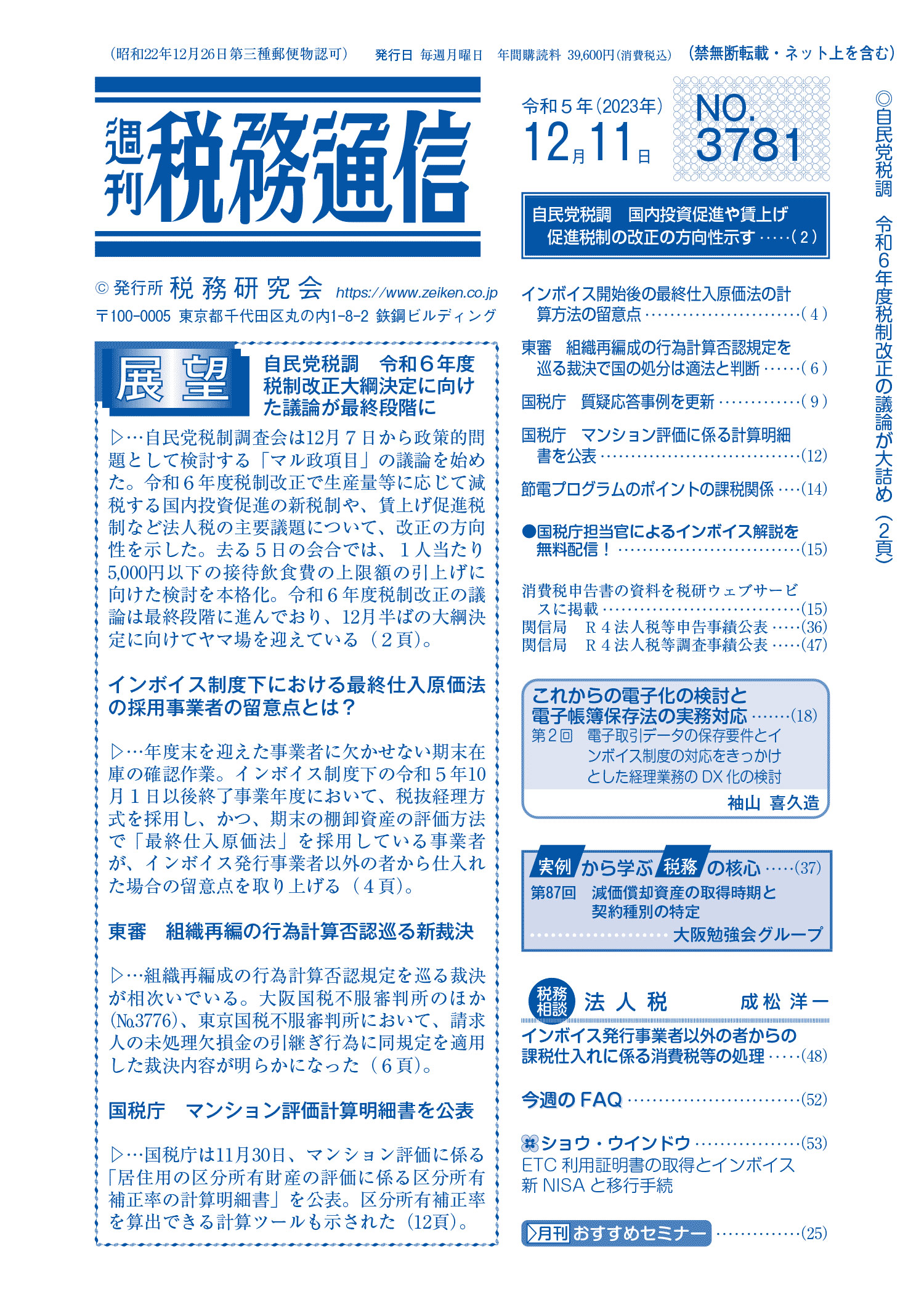 株式会社税務研究会から発刊されている週刊税務通信の2023年12月11日号に原稿執筆しています。