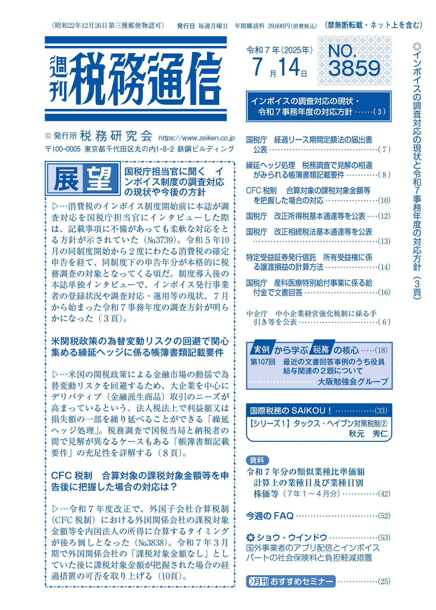 株式会社税務研究会から発刊されている週刊税務通信の2025年7月14日号に原稿執筆しています。