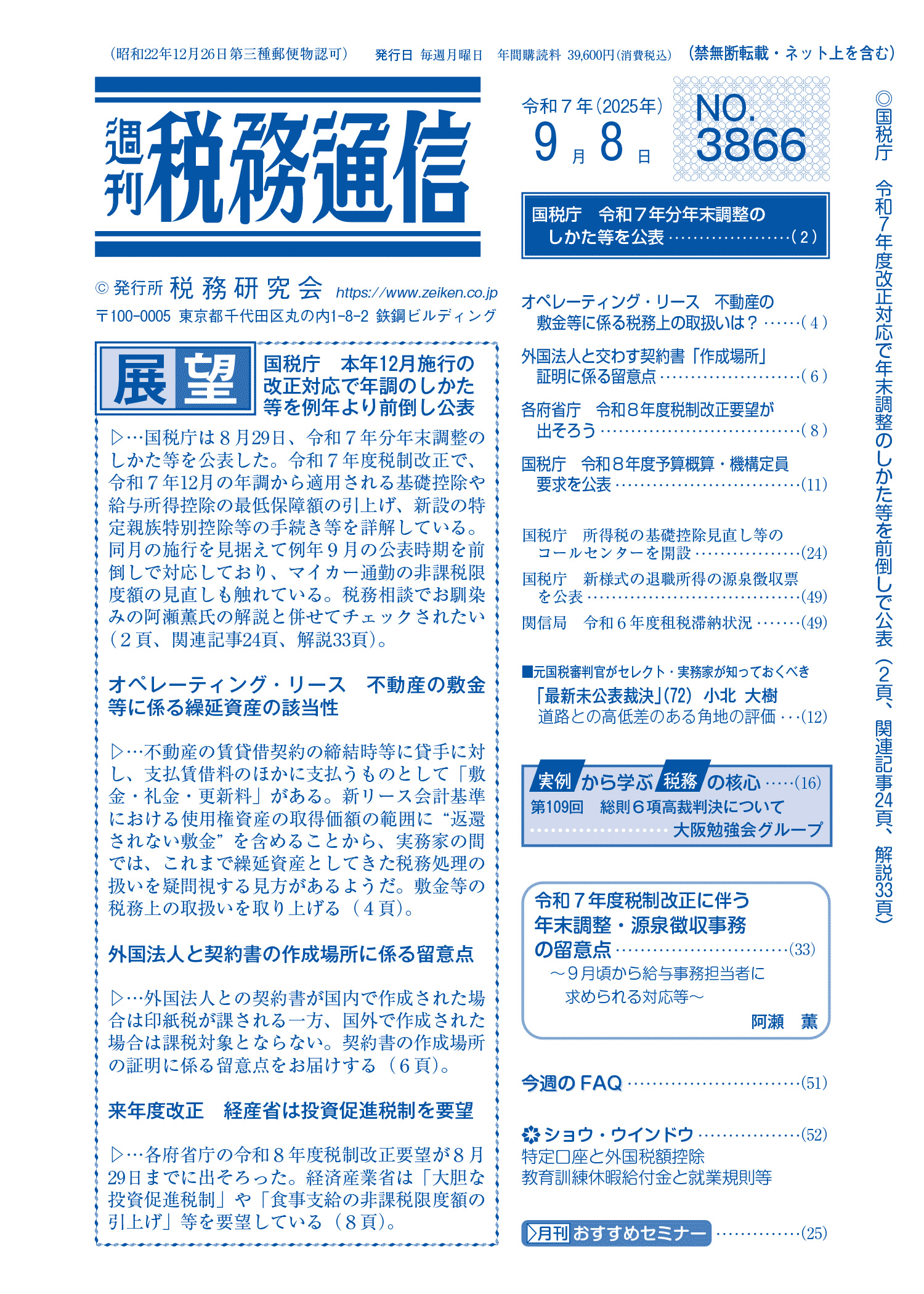 株式会社税務研究会から発刊されている週刊税務通信の2025年9月8日号に原稿執筆しています。