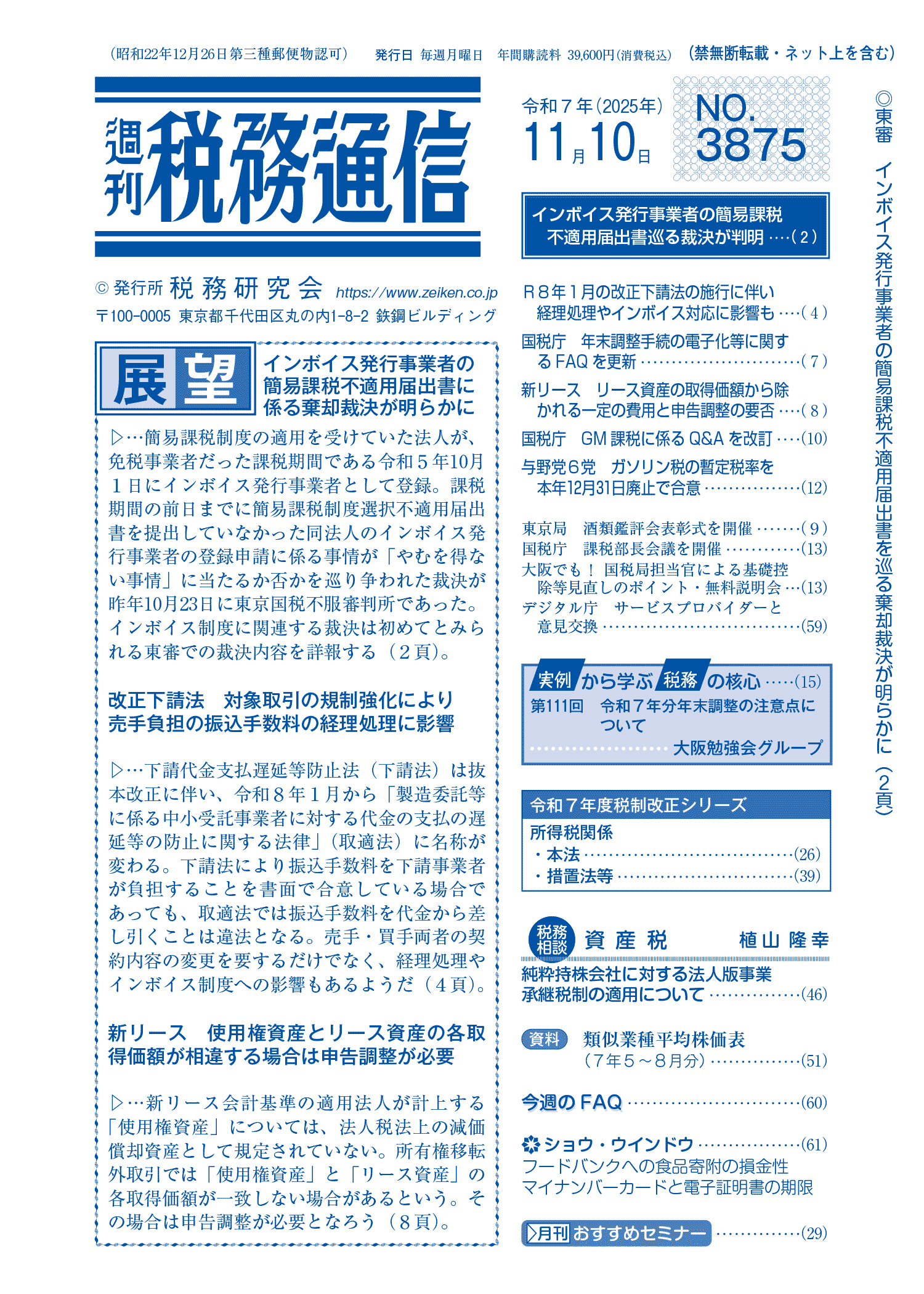 株式会社税務研究会から発刊されている週刊税務通信の2025年11月10日号に原稿執筆しています。