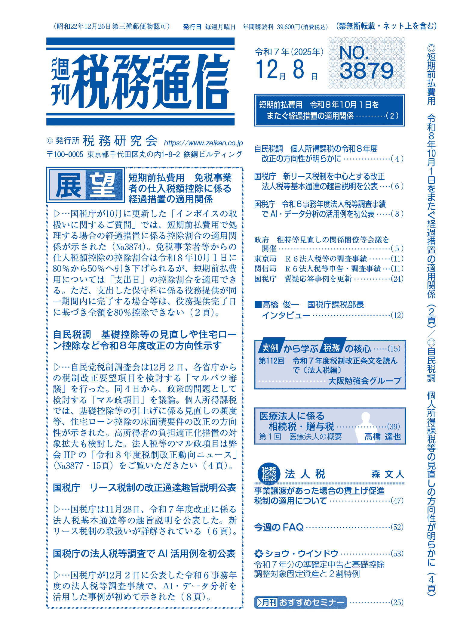 株式会社税務研究会から発刊されている週刊税務通信の2025年12月8日号に原稿執筆しています。